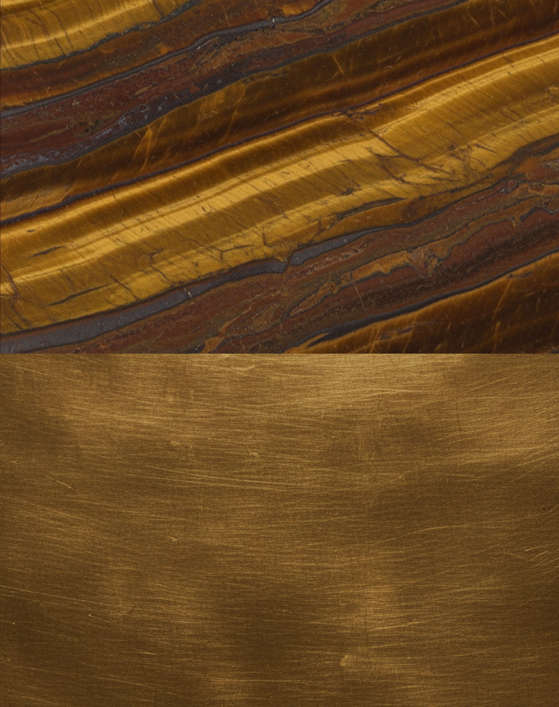 • Materials: gold-plated brass with black onyx, smoky quartz, or tiger’s eye, or recycled 925 sterling silver with malachite