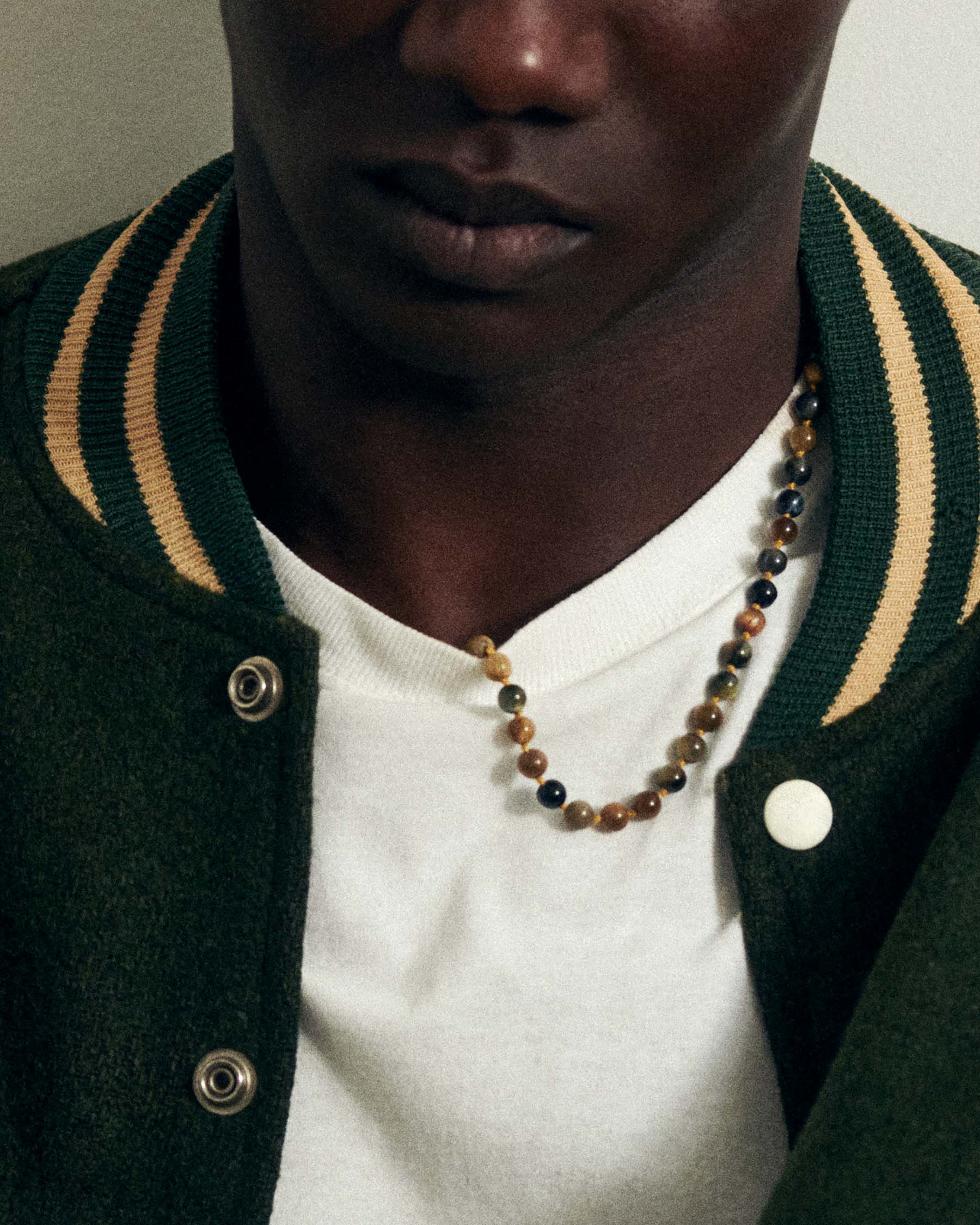 Beaded necklace crafted with 6 mm natural stone beads mounted on a knotted thread.•