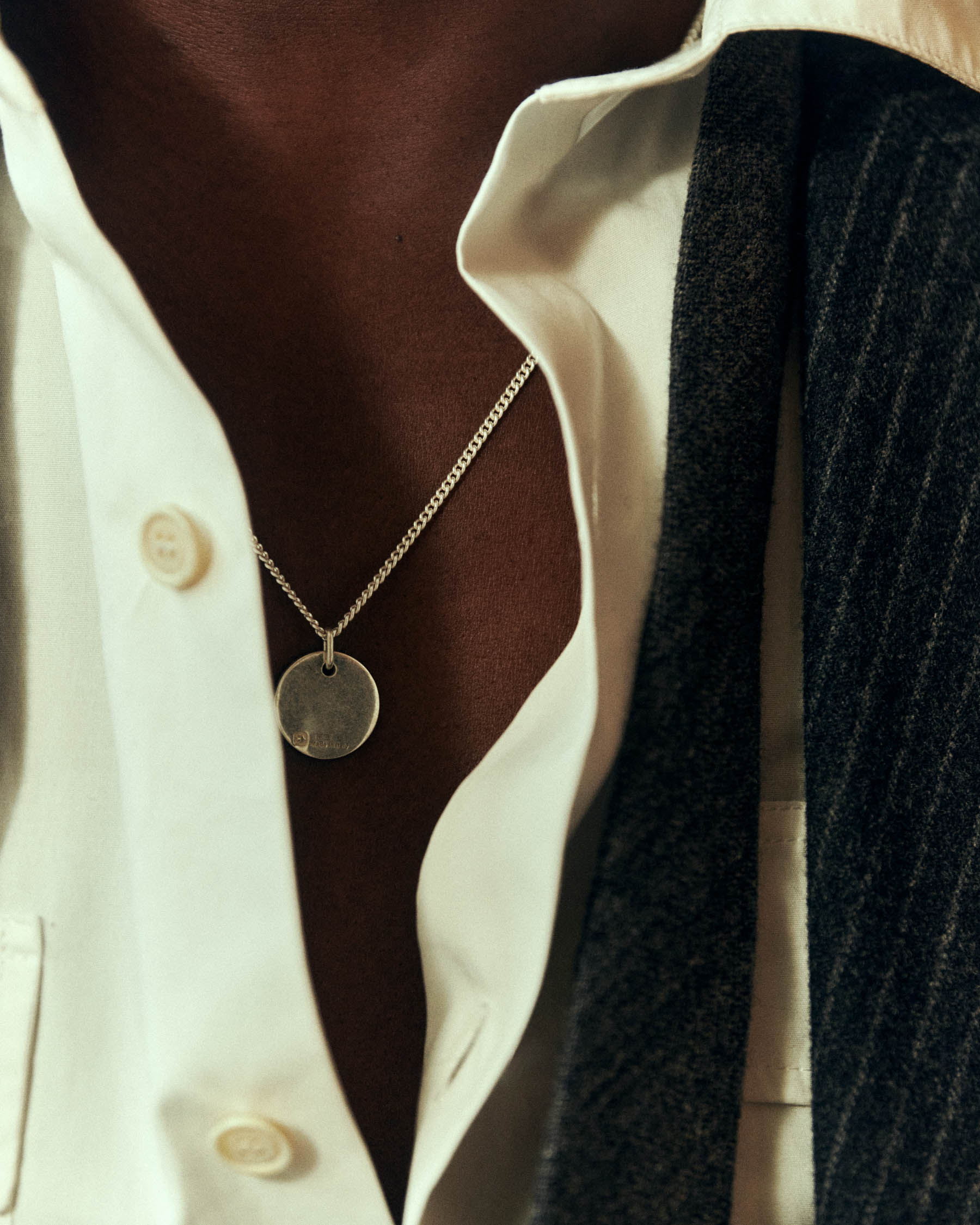 • Materials: recycled 925 sterling silver with light patina on a fine curb chain, or gold-plated brass on a fine trace chain